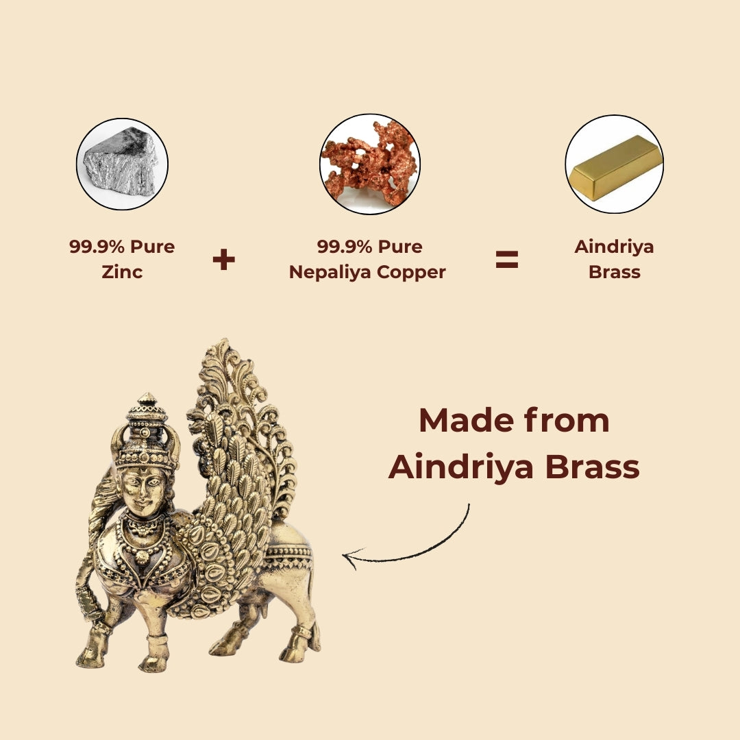 This is a religious statue of Kamdhenu, which is made of Brass (a strong combination of eight sacred metals: gold, silver, copper, iron, lead, tin, mercury and zinc), and which is associated with plenty, good fortune and unity. Kamdhenu is a Hindu mythological cow of plenty, the deity major, who is the life-giver and mother to all desires and who personifies sustenance, wholesomeness and love to all. The statue depicts the idol of Kamdhenu in the divine version with an elegant and graceful human-shaped face, with a beautiful crown and sophisticated jewellery. The shape of a cow symbolises innocence and nurturing power, and her wings are beautifully made, as well as the carvings she has on her back, which symbolise the greatness of the heavens. All its features, including the decorations on her breast and the feather-like carvings, are indicative of superb work and religious devotion. Kamdhenu is considered to be the nature of all gods and goddesses. Idolising her will provide security, happiness, wealth, and spiritual elevation. She is considered the bestower of blessings, well-being and good luck, which is why her presence is propitious in residential places, offices and temples. The retention of this idol is also regarded as very useful in the correction of vasta, the creation of positivity and the elimination of difficulties in life. The idol is made with Brass, and it emits powers of blessings and strength that are Godly. It is also an ideal gift to be given in the festivals such as Diwali, Navratri, and Gopashtami, and it is an auspicious one to be used to make a centrepiece in puja rooms. This Kamdhenu idol has a height of 3.5 inches, a width of 2.7 inches and weighs about 126 gm. This is not only a work of art but a spiritual treasure that brings cosmic peace, fertility, wealth, and harmony to the life of anybody who possesses it.