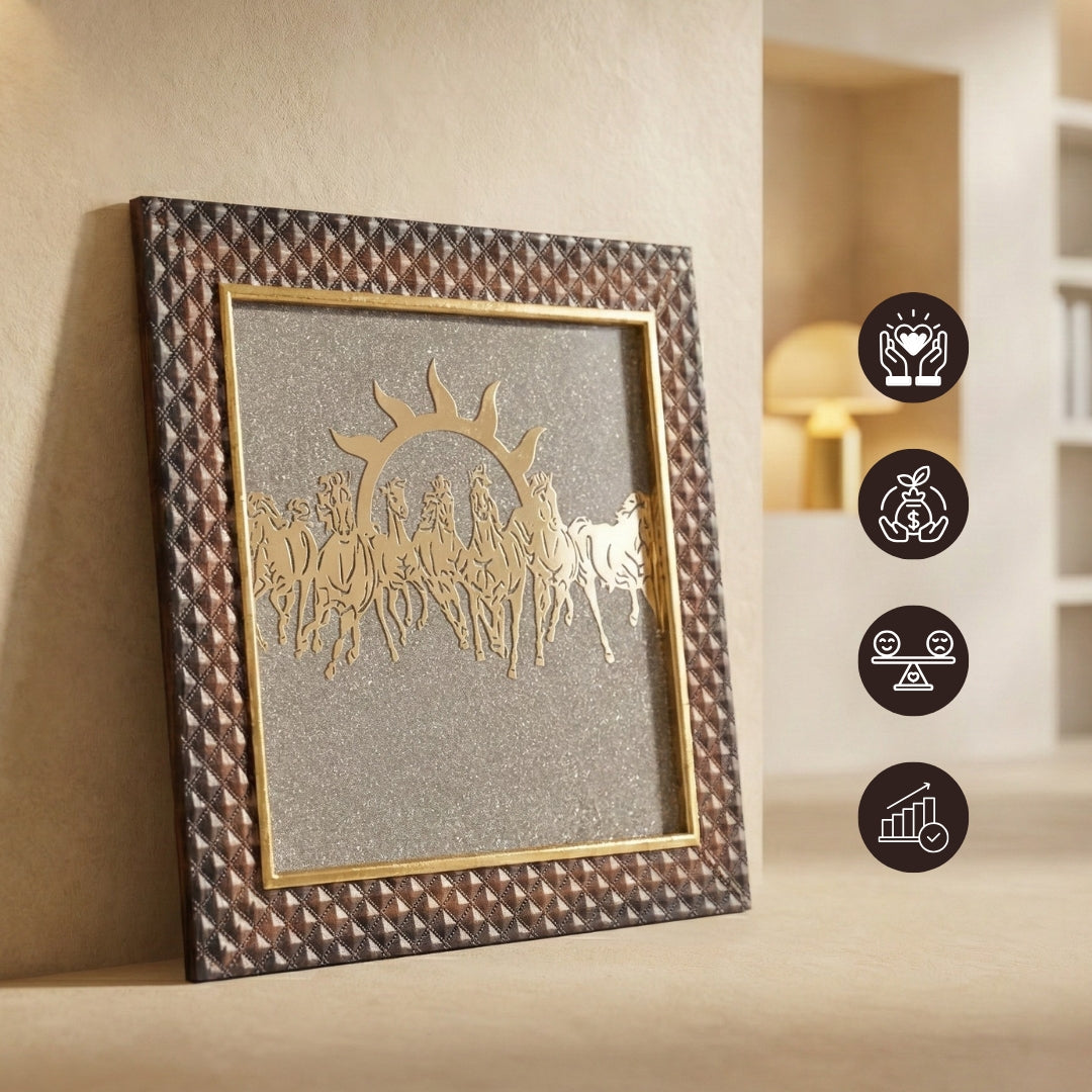 View compareAccording to Feng Shui & Vastu, "The seven horses frame" symbolises strength, progress and unstoppable success. It is representative of speed, determination and victory, and helps people reach their goals with clarity & confidence. Omindri brings you the Pyrite 7 Horse Frame; the divine symbolism of 7 galloping horses combined with the natural power of pyrite stone, attracts prosperity, positivity and protection.