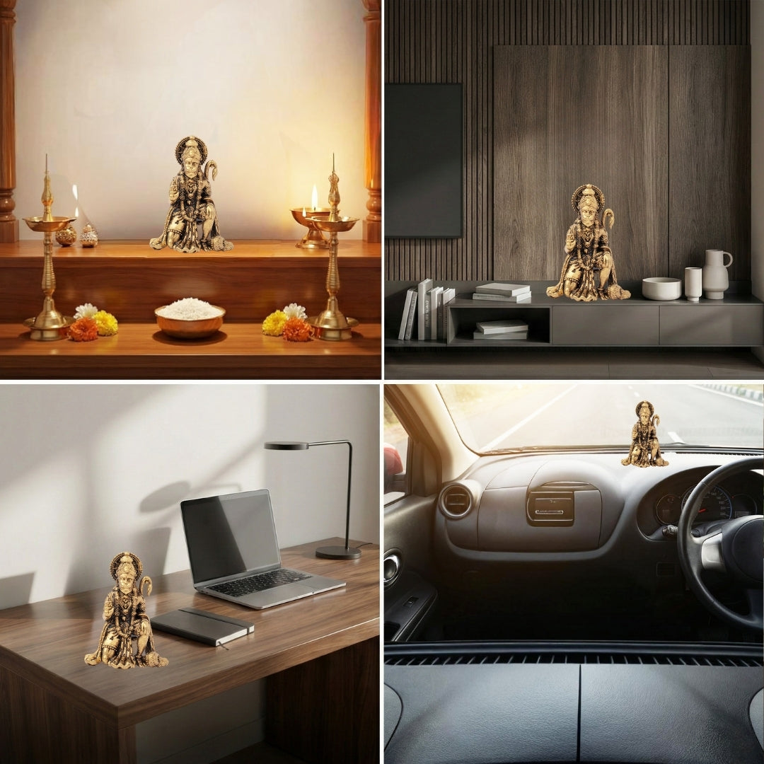 View compareThis is a god sculpture of Lord Hanuman Ji, which is made of Brass (a holy mixture of eight sacred metals), and it represents power, devotion, humility, and security. Hanuman Ji, the faithful servant of Lord Shri Ram, is adored as an icon of strength, spiritual purity and supernaturality. The idol depicts both spiritual power and calmness because it is in the Bal Mudra (kneeling posture) of Hanuman Ji. He is in Abhaya Mudra, with his right hand blessing the devotees, offering them protection and fearlessness, and his left hand is in grace, symbolising humility and submission at the feet of Lord Ram. By his side is the gada (mace), the symbol of strength and triumph over sin. The idol is made bright with a highly chiselled crown, garlands, and holy ornaments. The halo, beautifully designed behind his head, is symbolic of purity, the highest level of devotion and spiritual radiance. The idol is a masterwork of craftsmanship, featuring a long, curved tail and intricate art. It is said that making sacrifices to this Brass Bal Hanuman idol eliminates obstacles, protects worshipers against bad things, and grants wisdom, power, and devotion. It is particularly strong when it comes to people who want to find courage in their adversities, inner tolerance and spiritual leadership. This idol is ideal in your home temple, office, or sacred area to invite the blessings of protection, positivity, and prosperity. It is also a good present on festivals and other occasions such as Hanuman Jayanti, Ram Navami, Navratri, and Diwali. This idol is created with devotion and accuracy; 2 inches high, 1.5 inches in width, and 53 gm in idol combined depth, then there is the divine in the embodiment of faith and energy of divine power and the faith of everyone involved.