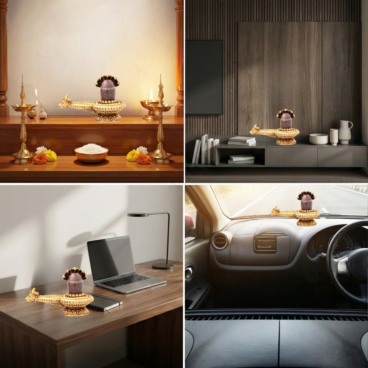 View compareThis is a divine masterpiece that is a combination of a naturally formed Shivling in the holy river Narmada, the Brass Jalheri base, which is beautifully handcrafted. The marriage of the sacred stone and the eight-metal alloy is spiritual, pure, and in balance with the cosmos and, therefore, a significant addition to any divine area. It is believed that the Narmadeshwar Shivling has been of great significance in the Hindu tradition in the form of the infinite energy, protection, and blessings of Lord Shiva. It is regarded as the most desirable part in rituals and meditation because it has been believed to bring good health, prosperity, and spiritual development. It has the naturally polished, smooth texture of divine authenticity and spiritual power. The Brass Jalheri is an auspicious alloy of eight metals, known as a divine base of Shivling, made on Brass Jalheri (a combination of gold, silver, copper, lead, tin, iron, zinc and mercury). The Jalheri is decorated with elaborate carvings and decorative designs that help the cosmic energy to flow with, but also provide beauty to the design. Stone has great power that enhances the positive effect of Shivling and provides a state of calm, unity, and safety. It is said that by having this divine duo in your puja room, temple, office, or even meditation chamber, you are cleansing your environment and driving out evil spirits in the air and creating good fortune. It is also very auspicious on Mahashivratri, the Shravan month and daily worship. The Shivling and Jalheri set is handcrafted with devotion by skilled artisans, a representation of old craftsmanship, and is a spiritual treasure as well as a gift that never goes out of fashion even during housewarmings, business openings, and festivals. Height: 2.3 inches, width: 3.5 inches, weight: approximately 132 gm.