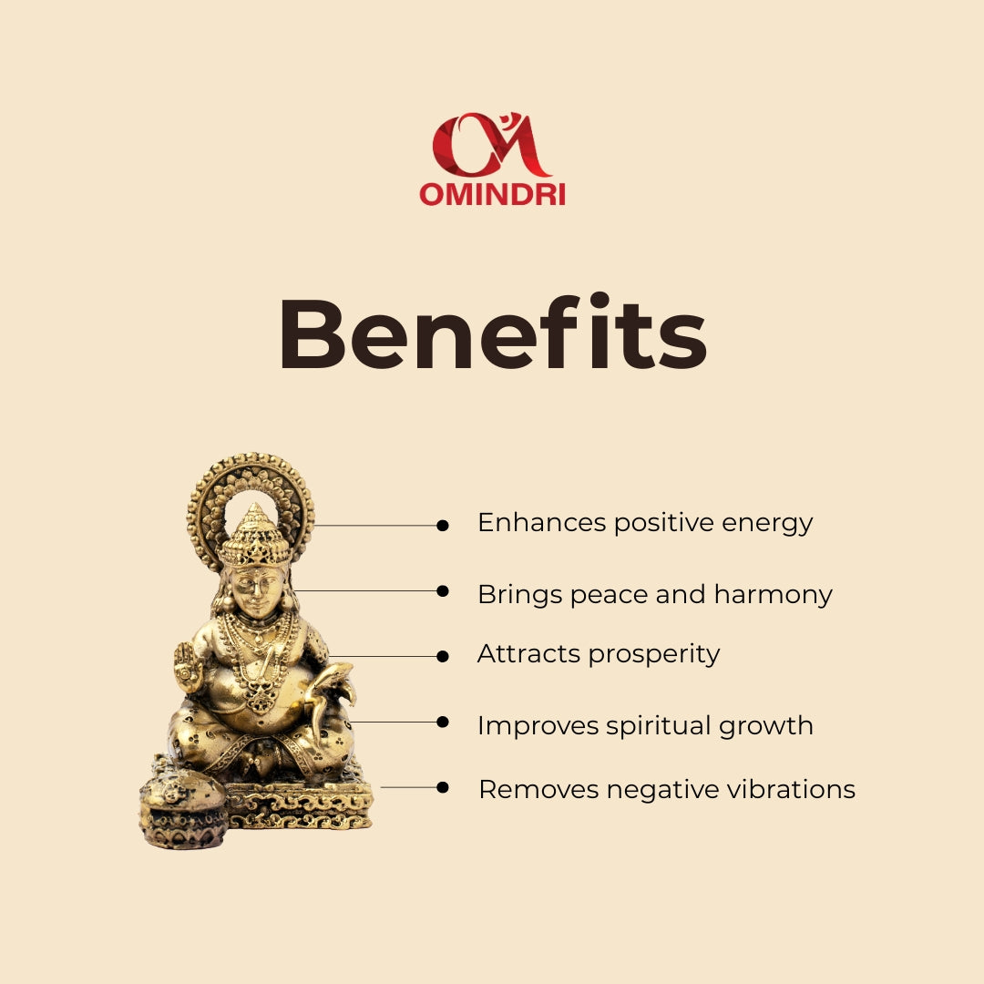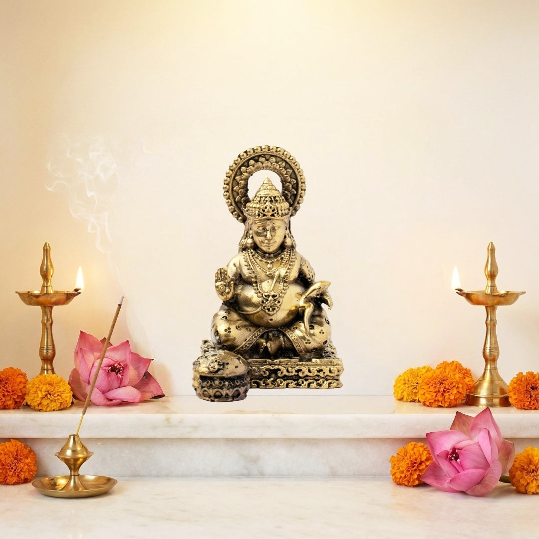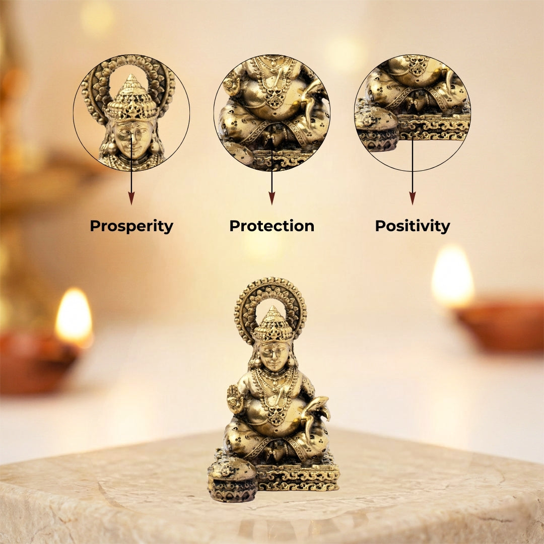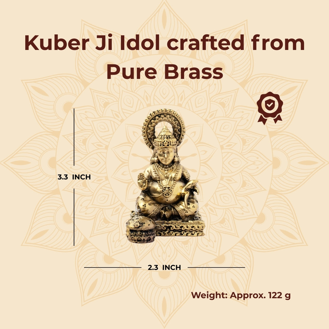 View compareIt is a powerful wealth, prosperity and abundance symbol, which is an idol of Lord Kuber Ji made in Brass (a holy mixture of eight sacred metals). Being the god of riches and fortune and being revered as the treasurer of the gods (Yaksha Raja) and the protector of the North direction, Lord Kuber is worshipped as the god of fortune and wealth. The idol depicts Kuber Ji in an elegant seated position with divine charisma and power. His strong but still composed face brings forth confidence and positivity. He holds a mace (gada) in one hand, which means protection and control of the wealth, and the other hand is Abhaya Mudra, giving the devotees blessings of wealth, security and spiritual development. His fat body appearance, with expensive jewellery and clothes, symbolises plenty and completeness of life. A treasure pot (Nidhi Kalash) is lying next to him, which represents endless prosperity and riches. The carved crown, holy garments, and superb decorations illustrate the work of the talented craftsmen. The halo of divinity in the background of his head also points out his divine presence as the heavenly treasurer of the universe. It is said that by worshipping this Brass Kuber idol, the person will be able to achieve financial growth, stable business, and eliminate such hindrances as debt and poverty. It does not merely welcome material luck but also adds some spiritual blessings to life. The idol is particularly fortunate in Diwali, Dhanteras, and Akshaya Tritiya, so it can be placed in any of the puja rooms, office, shop, or cash box. It is also an ideal housewarming, business start-up and party gift. This, 3.3 inches high, 2.3 inches wide, and weighing about 122 gm, is not merely an art object, but a divine manifestation of prosperity, good luck, and gods.