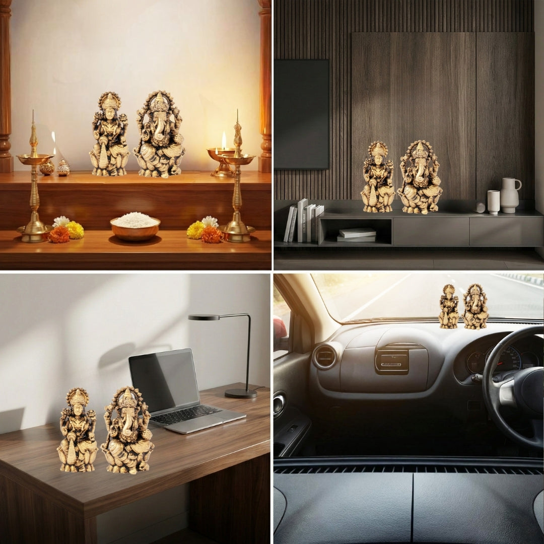 This good fortune of Maa Lakshmi and Lord Ganesha idols, beautifully made in Brass (sacred combination of eight sacred metals), represents good fortune, wisdom, and good starts. Due to the Hindu tradition, it is very holy to worship Lakshmi and Ganesha simultaneously since Maa Lakshmi brings wealth and good luck, whereas Lord Ganesha eliminates the obstacles and gives wisdom. They form a unity of material success and spiritual development which is divine. Maa Lakshmi is beautifully painted on the left to sit on a throne to hold lotus flowers in her hands. Lotus means purity, spiritual vitality and unceasing growth. Her peaceful and kind smile is filled with blessings of plenty, harmony and prosperity, which make her the goddess of wealth forever. On the right side, there is Lord Ganesha, who is worshipped as the destroyer of all impediments and the bringer of knowledge, in a calm and majestic posture. He carries the modak (sweet) in order to be filled, the axe to eliminate negativity, the lotus to enlighten and the goad to lead his path. His big ears and kindly eyes are a representation of being a good listener to prayers and also a bestower of happiness and wisdom. The two idols have beautifully crafted crowns, ornaments, and sacral clothing, which depict good traditional art. Their divine energy is boosted, and they are durable and spiritually important because of the use of Asthdhatu. It is said that having this idol placed in your home, office, temple, or workplace will bring you wealth, wisdom and positivity. It is very propitious in Diwali, Dhanteras, housewarmings, business openings, and weddings. Having a height of 1.5 inches, a width of 1.5 inches and weighing approximately 40 gm, such a Lakshmi-Ganesh set is an ideal spiritual gift and also a potent device of Godly blessings.
