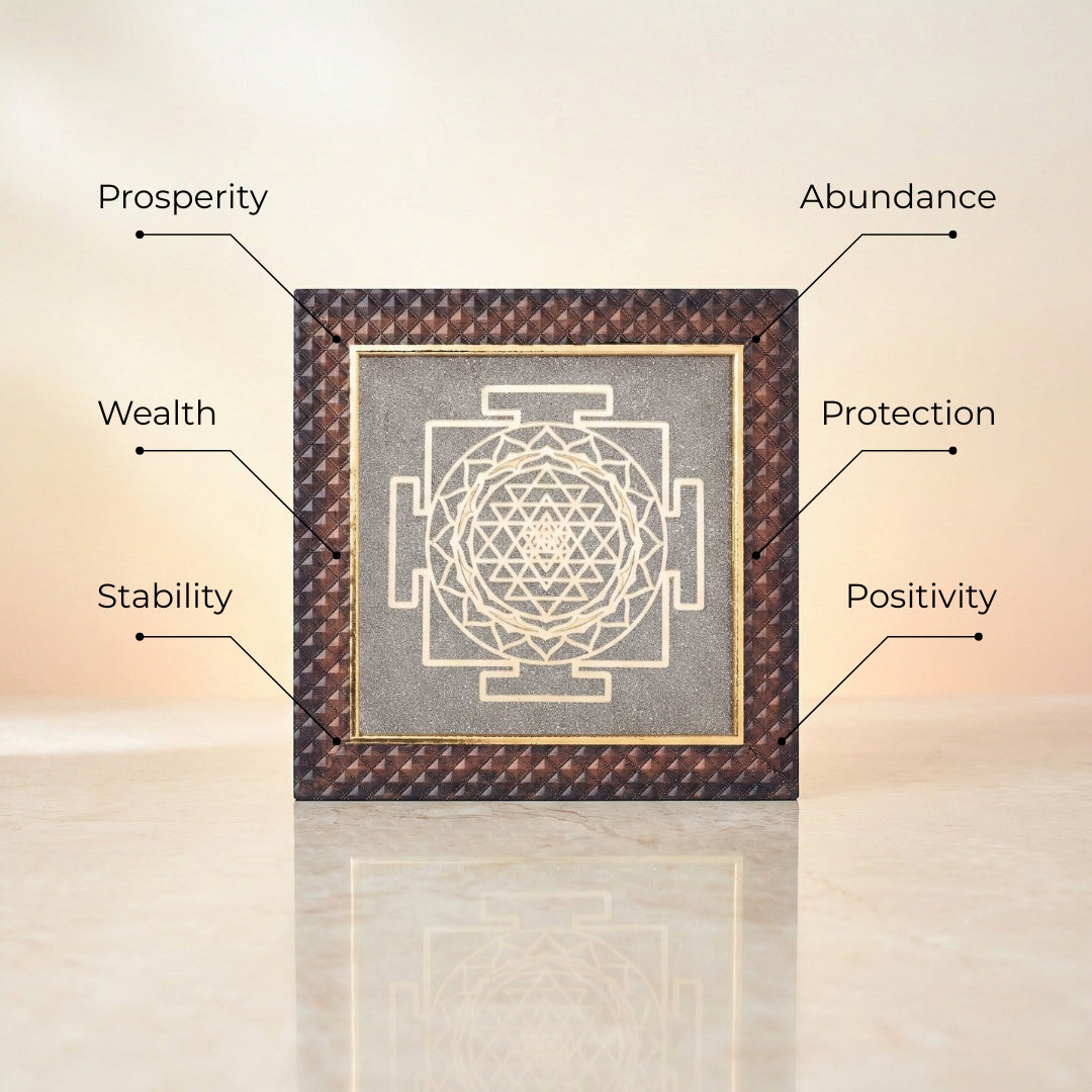 Omindri's Pyrite Shri Yantra Frame is a distinctive spiritual product for attracting wealth, protection, and balance into your life.