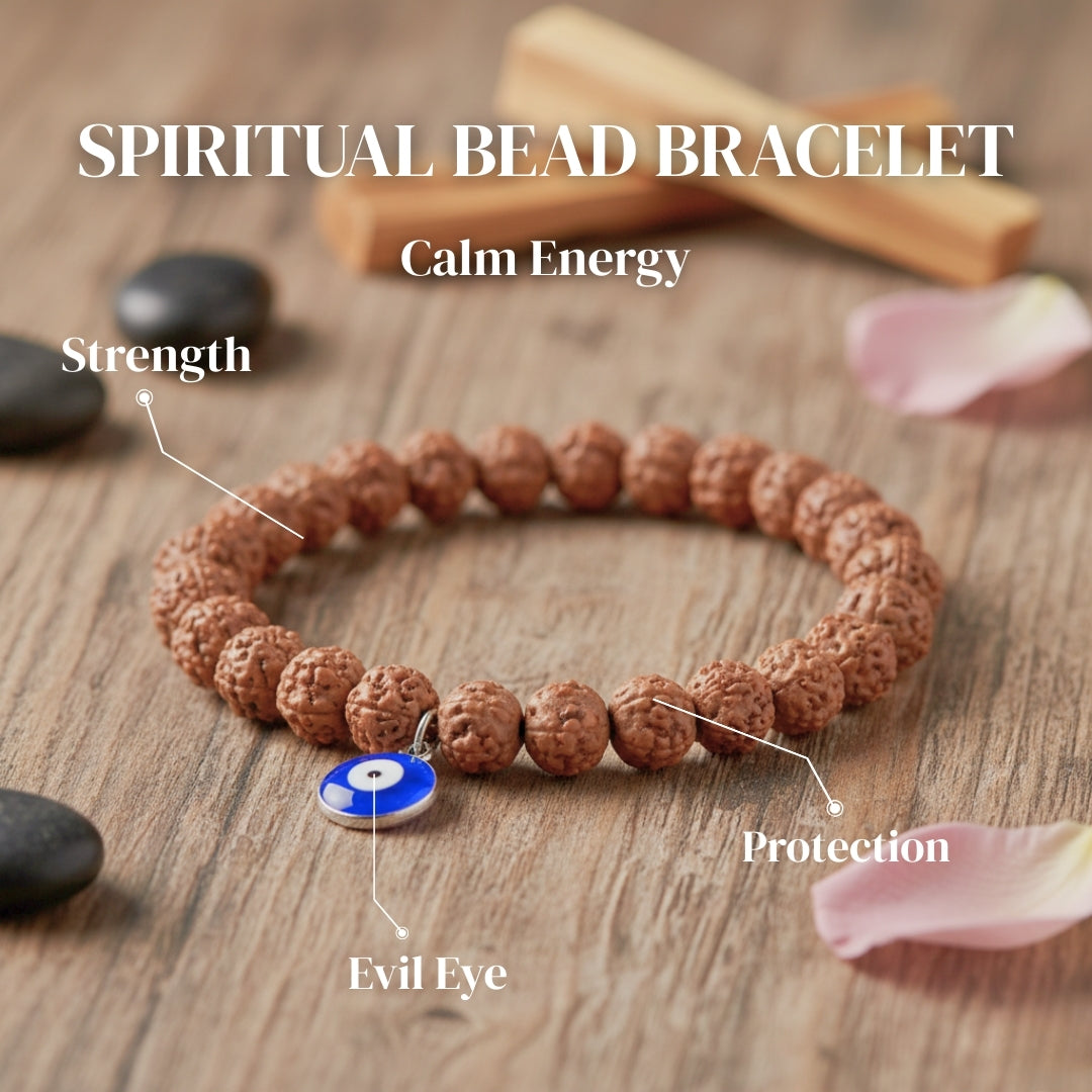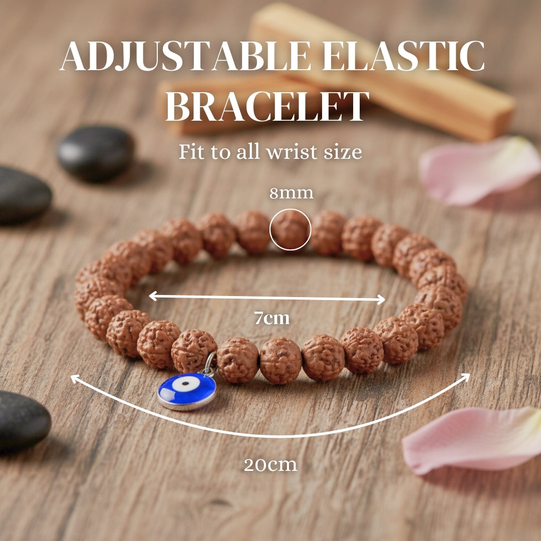 Pair the protective Evil Eye charm with this Rudraksha bracelet to experience both traditions and trendy style. A good combination of energy, faith and fashion.